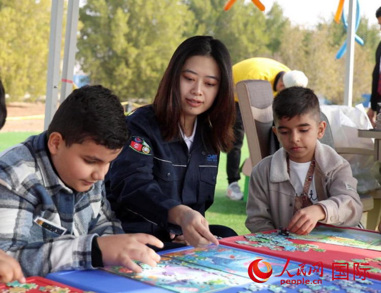 中方员工带着伊方员工孩子玩拼图。人民网 伊纳斯·易卜拉欣摄