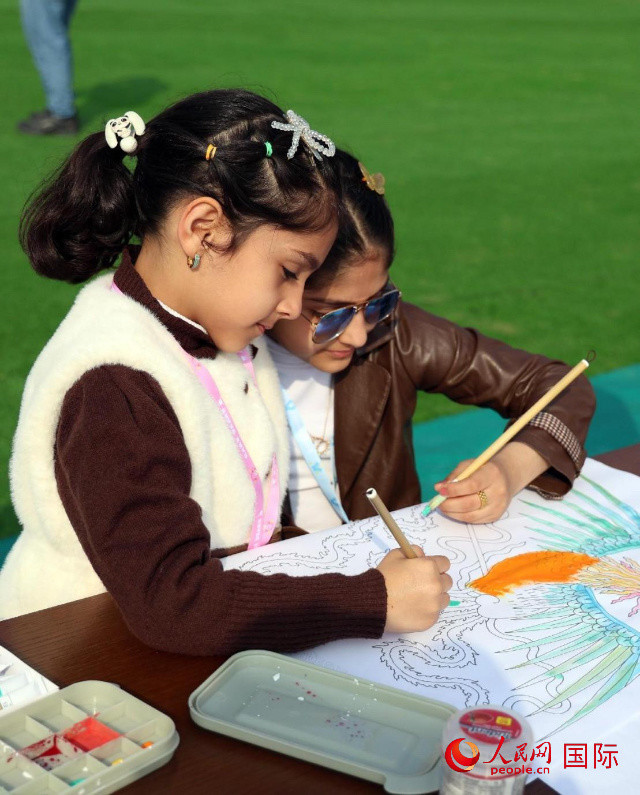 两名女孩在给图画上色。人民网 伊纳斯·易卜拉欣摄